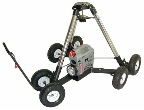 Photo shows JMI Universal Wheeley Bars with the 10" Pneumatic Large Wheel Upgrade, optional Battery Pack Holder and an optional battery pack. The dual inboard wheels on each rear "axle" help keep a narrow profile. The product also includes a pull handle.