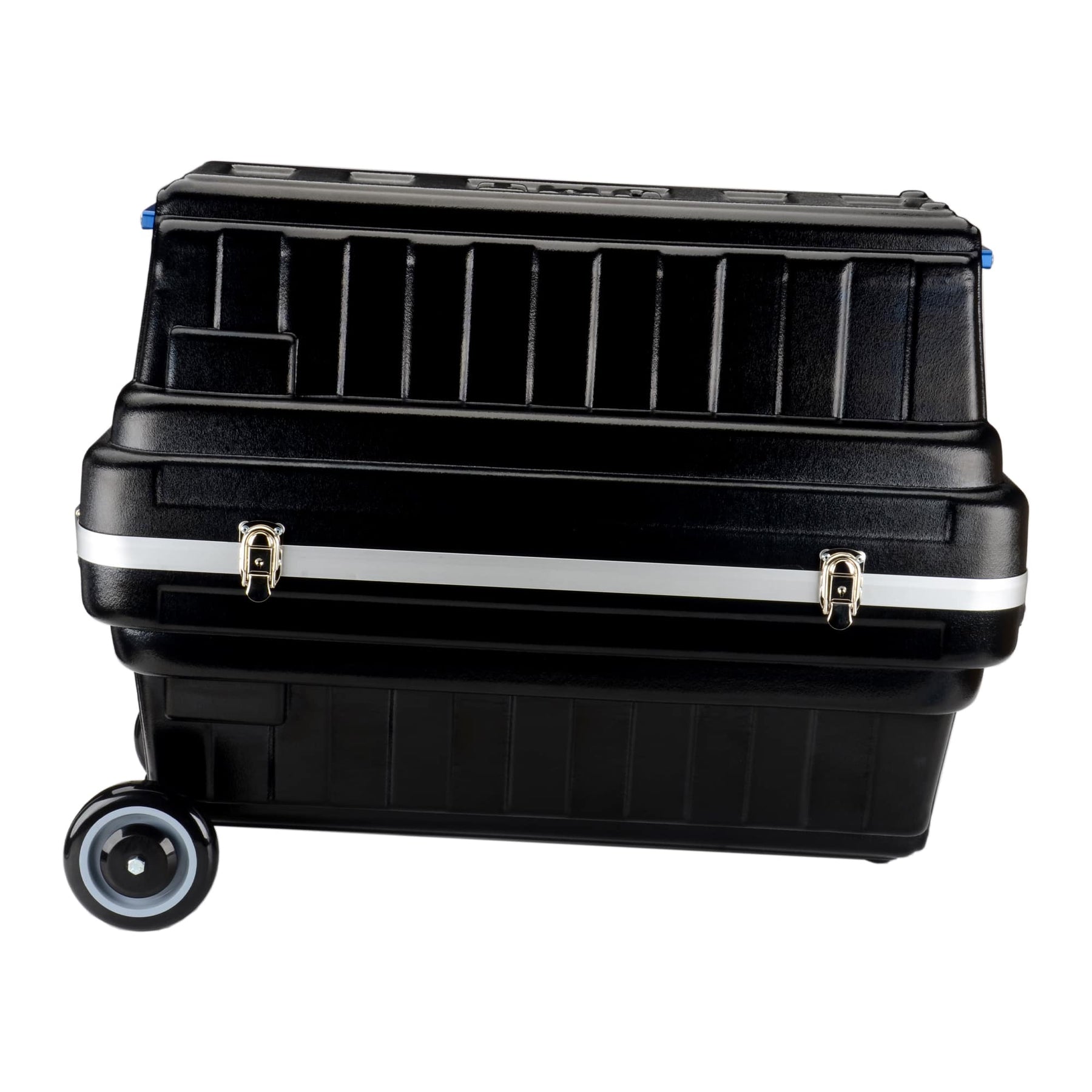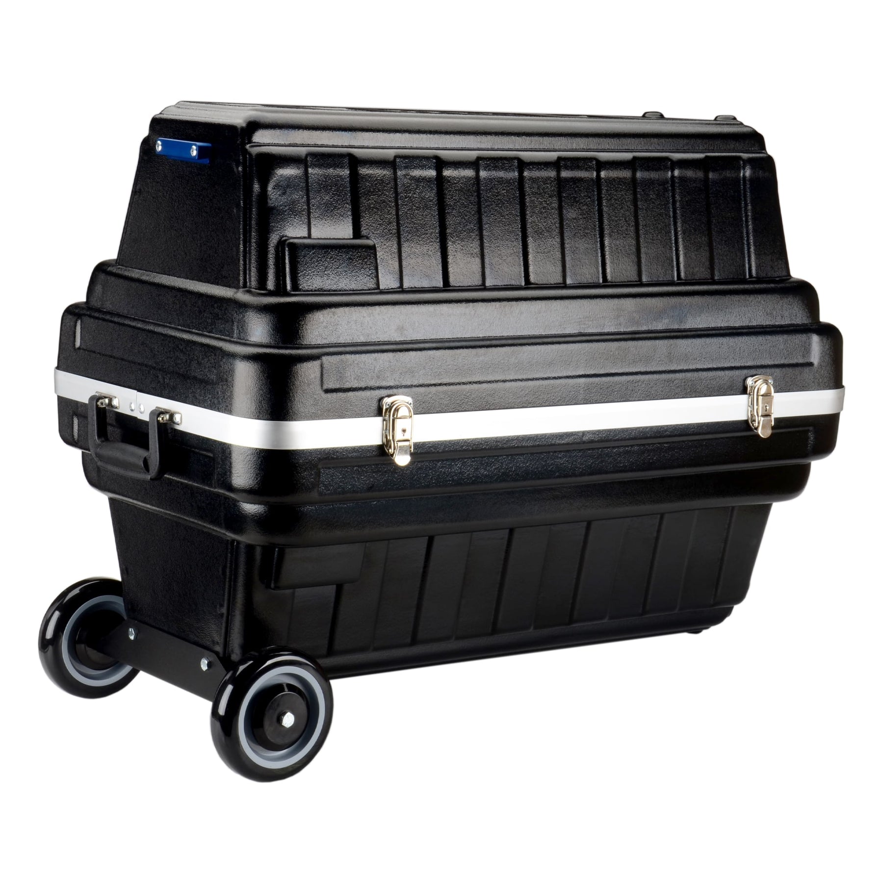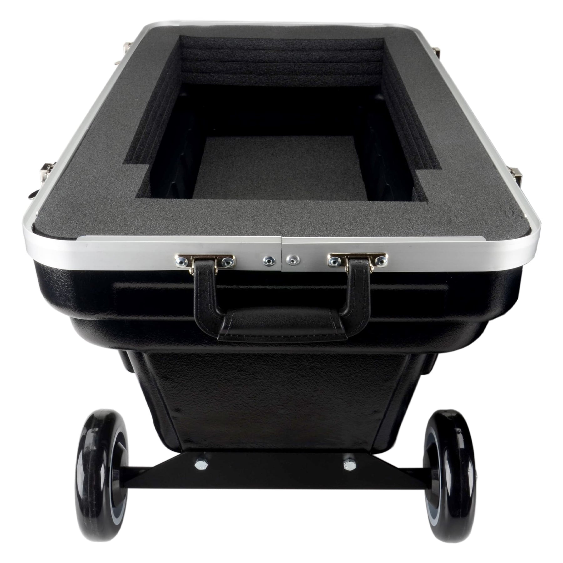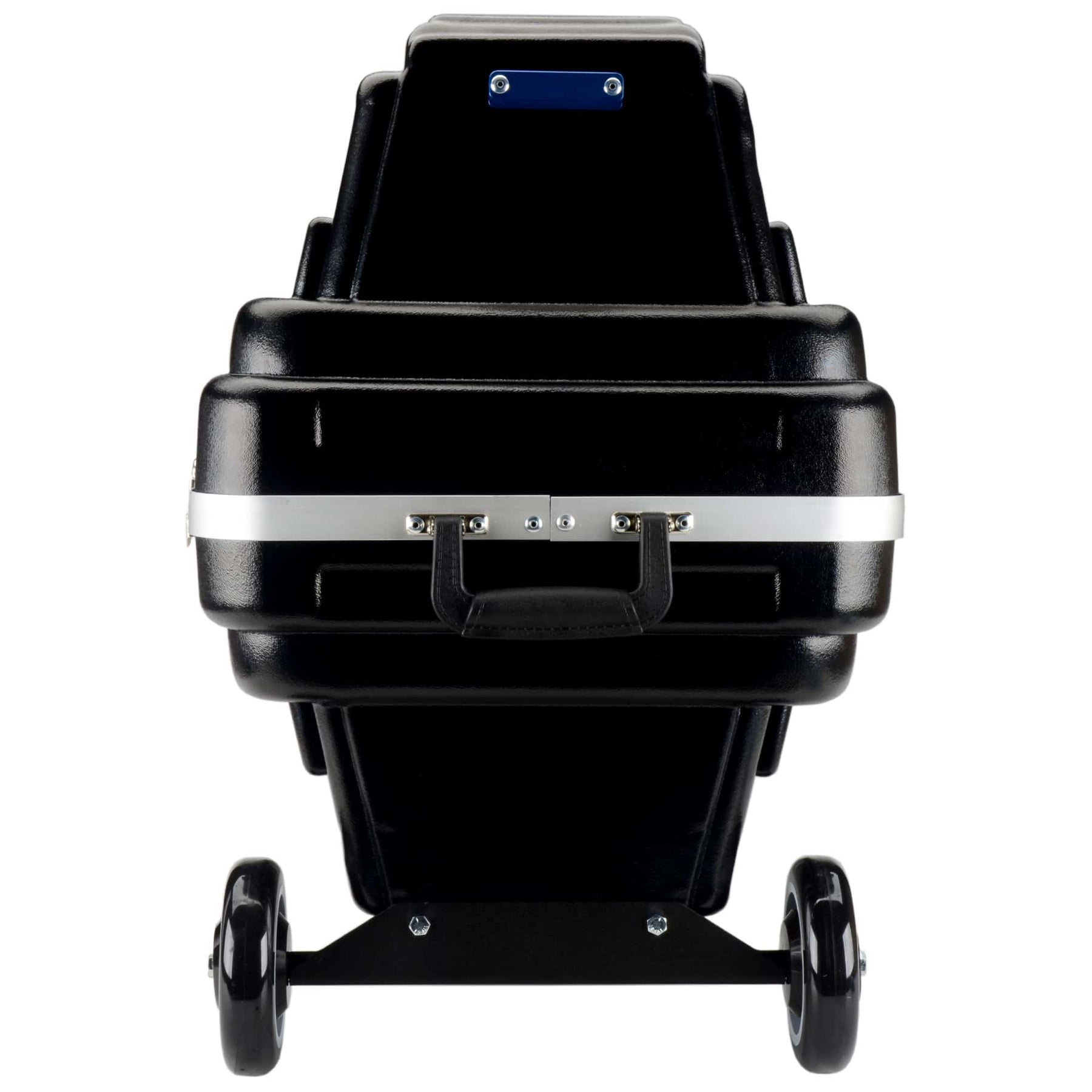 Includes four latches (two lockable) for the removable cover (no hinge), two steel-reinforced handles and die-cut foam lining with compartments for telescope, eyepieces and accessories. It can be carried (requires two people) or pulled using the attached wheels. Both the finder scope and hand unit must be detached and placed inside the case.
