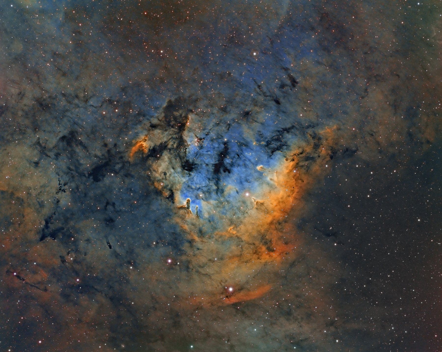 H-α (hydrogen-alpha) at 656 nm (nanometers) is deep red in color and the most popular narrowband H-alpha filter. Hydrogen is ubiquitous in the cosmos and is present in emission nebula (North American, Pelican), planetary nebula (Dumbbell, Ring), Wolf-Rayet objects (Crescent, Thor’s Helmet), and supernova remnants (Veil). Many imagers like to present just a black-and-white H-α image of an object. It is has a beauty all by itself, like an Ansel Adams photo. However, most imagers blend their H-α data into their red RGB data to enhance structural detail while maintaining a “natural” look. Therefore, the H-α filter should be your first narrowband addition to your LRGB filters. The basic imaging set of 5 filters becomes LRGBH-α.